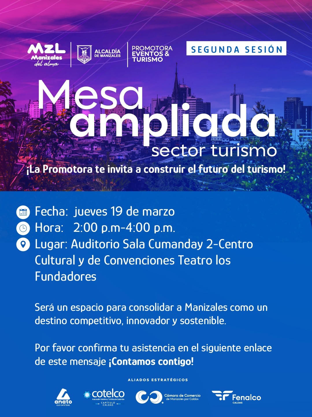 La Promotora de Eventos y Turismo de Manizales tiene el gusto de invitarlos a participar en la Segunda Mesa Ampliada de Turismo, un espacio de diálogo y construcción colectiva orientado a fortalecer y enriquecer nuestra oferta turística.